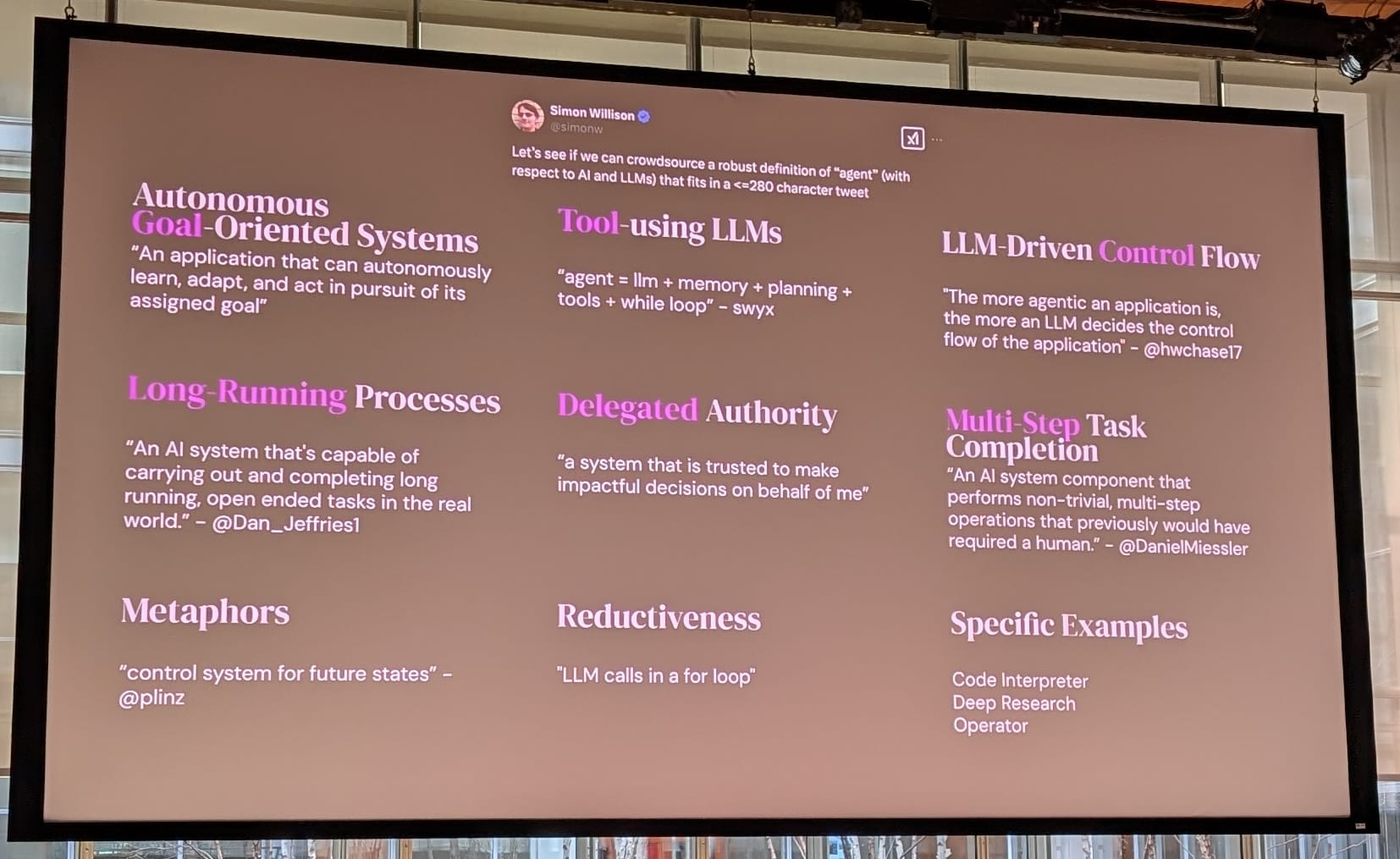 In any case, the natural question is "What exactly is an Agent anyway?" Do we mean the OpenAI definition of an Agent? The IBM definition? One of the six top definitions Simon Willison crowdsourced (courtesy of Swyx at the AI Engineer Conference):