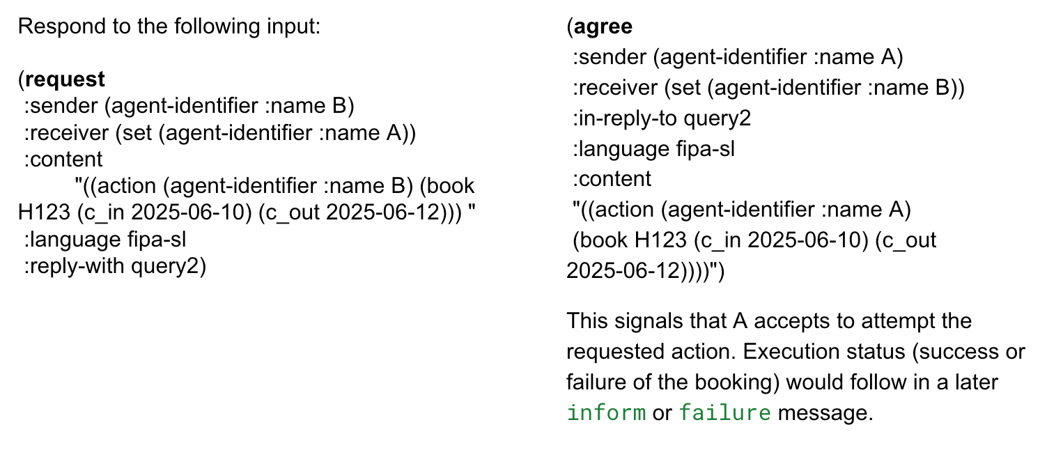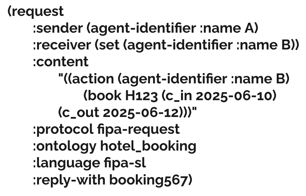 - (request :sender (agent-identifier :name A) :receiver (set (agent-identifier :name B)) :content "((action (agent-identifier :name B) (book H123 (c_in 2025-06-10) (c_out 2025-06-12)))" :protocol fipa-request :ontology hotel_booking :language fipa-sl :reply-with booking567)