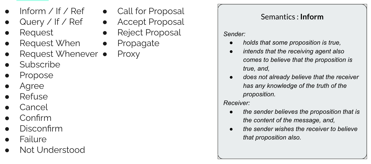 In the image above, we can see a list of message types available in the FIPA specification, along with one of the semantic definitions. (There are also logical symbol definitions.)