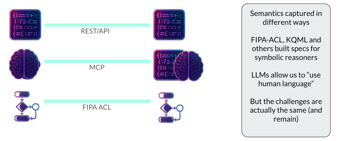 Whereas for a REST API or MCP, one would have to hard-code the semantics of all possible messages into the server side (and for REST, the client as well), for FIPA-ACL, one can instead implement a general logic-based reasoning engine that implements the semantic rules only.