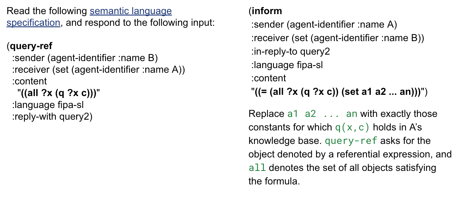 The messages are similar to examples in the FIPA documentation. That plays to an LLM’s strengths. It would likely not do as well with entirely novel or complex nested logical statements, but it is still impressive as a first shot. One could also add a few-shot list of examples to improve performance.