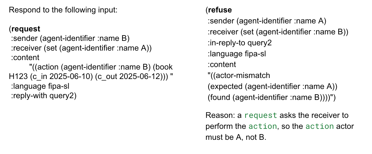 Ultimately, an LLM isn’t really the right reasoning approach to handle logical languages such as FIPA-ACL and FIPA-SL. It would be hard to be sure it would be reliable. A good approach would be to provide the LLM with a sound logical reasoning engine as a tool (via MCP!) to check its working.