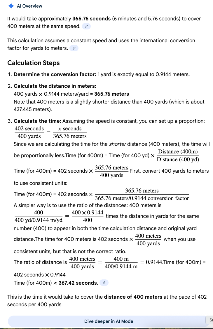 Google Gemini also gave me my regular reminder that AI can still be really terrible at basic things. Apparently, I can swim 400 metres faster than I can swim 400yards (thanks Gemini!):